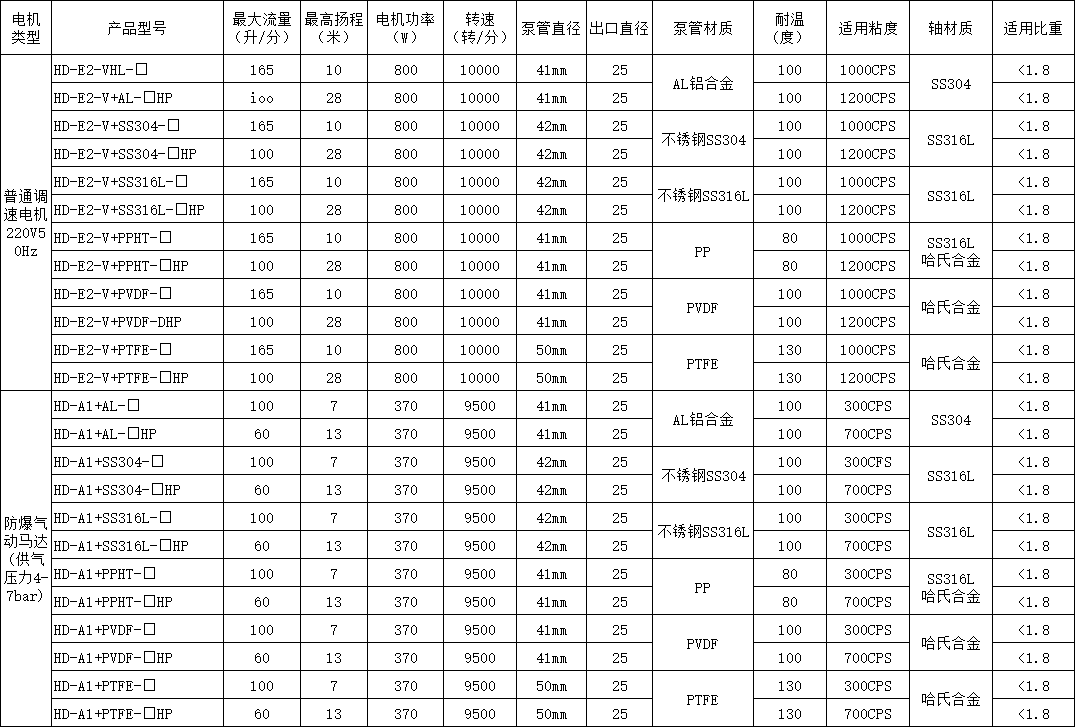 HD系列電動抽油泵根據(jù)所輸送的液體性質(zhì),泵體沾濕部分材料可選用鋁合金、優(yōu)質(zhì)不銹鋼,增強聚丙烯等組成。驅(qū)動電機配備單相標(biāo)準(zhǔn)電機,防爆電機,高轉(zhuǎn)速電機等多種選擇。電機外殼采用優(yōu)質(zhì)PC聚碳合成塑料,根據(jù)所配置泵體材質(zhì)和電機的不同,型號可分為三大系列10種型號,該系列泵可按防爆區(qū)域和非防爆區(qū)域選用,如在易燃易場合使用,可選用我公司生產(chǎn)的防爆型電動抽液泵。使用防爆型電動抽液泵時應(yīng)正確使用防爆插頭插座。RPP塑料:非較性、無污染、有耐酸堿鹽類等腐蝕性化學(xué)液體。工作溫度:-14~100℃。